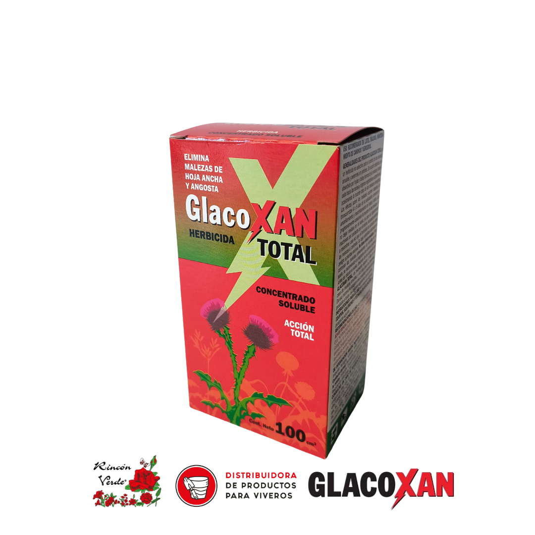 GlacoXAN TOTAL es un herbicida no selectivo capaz de controlar todas las malezas de hoja ancha y hoja angosta ya sean anuales o perennes ubicadas en canteros, caminos, etc. Se absorbe por los tejidos verdes de la planta para posteriormente trasladarse en sentido descendente hacia las partes subterráneas de la misma (rizomas, tubérculos, raices) ocasionándole la muerte. Este proceso no es rápido siendo más lento en las especies perennes las que comienzan a amarillar a los cuatro/cinco días posteriores a la aplicación del producto, proceso que se continua con el marchitamiento y muerte. GlacoXAN TOTAL es rápidamente biodegradado al tomar contacto con las partículas del suelo por lo cual no existen riesgos de contaminación ni fitotoxicidad en el caso de querer practicarse a posteriori una plantación o siembra siendo por otro lado un producto no volátil, lo cual disminuye los riesgos contra plantas útiles.